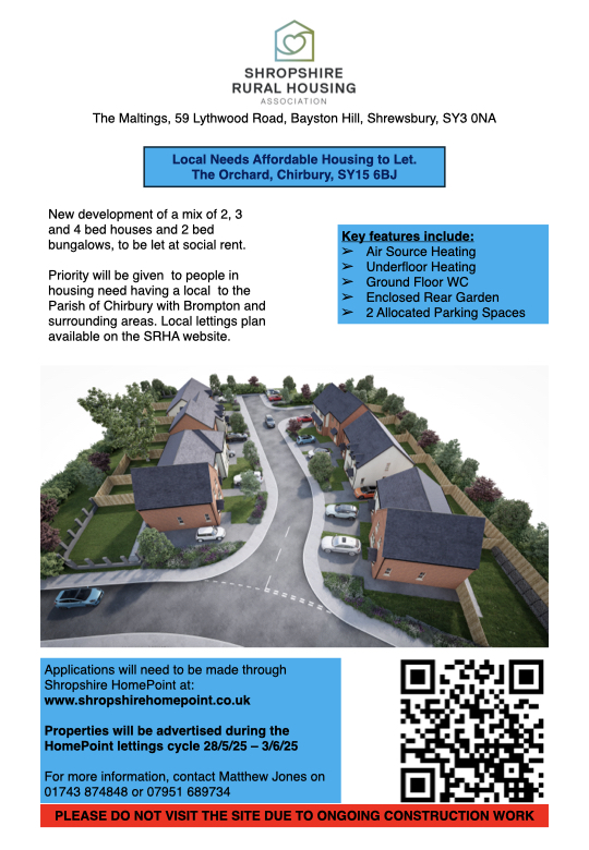 The Shropshire Rural Housing Association development of 13 new build properties in Chirbury comprises of a mixture of 2, 3, & 4 bed houses and 2 bed bungalows. The properties will be advertised on Shropshire HomePoint during the lettings cycle 28/05/2025-03/06/2025.
